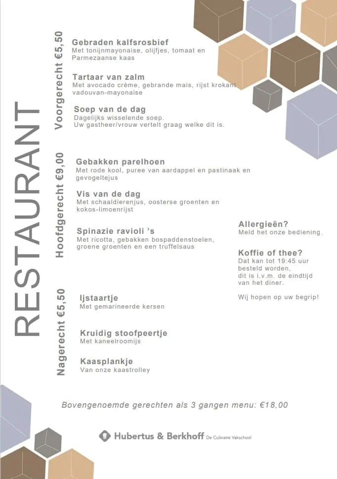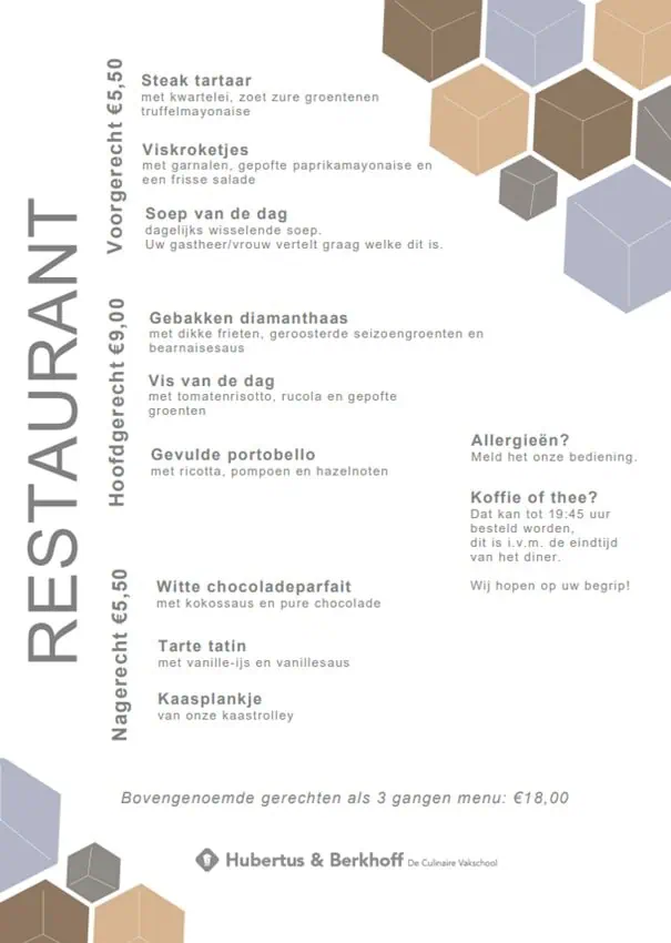 In restaurant Délicieux tonen leerlingen hun kook- en serveerkunsten. Op dinsdag-, woensdag- en donderdagavond kunt u van 18.00 tot 20.00 uur terecht voor een viergangen diner voor €18,- (incl. amuse, excl. drankjes). U heeft dan een keuze uit vier voor-, drie hoofd- en vier nagerechten. Van maandag t/m vrijdag kunt u van 12.00 uur tot 13.15 uur terecht voor een driegangen lunch voor €12,50(excl. drankjes). Deze lunch- of dinerervaring kunnen wij u van harte aanbevelen.